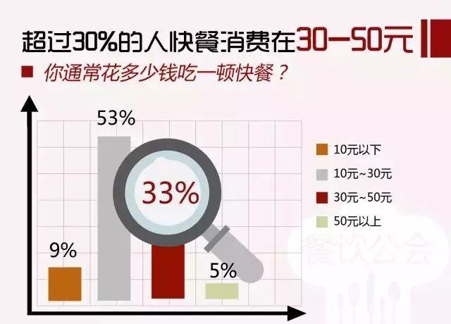 值得注意的是,33%的人表示他们的快餐消费在30-50元,这个数据接近整个餐饮业的人均消费。在消费升级的趋势下,快餐和正餐的界限正在消失。