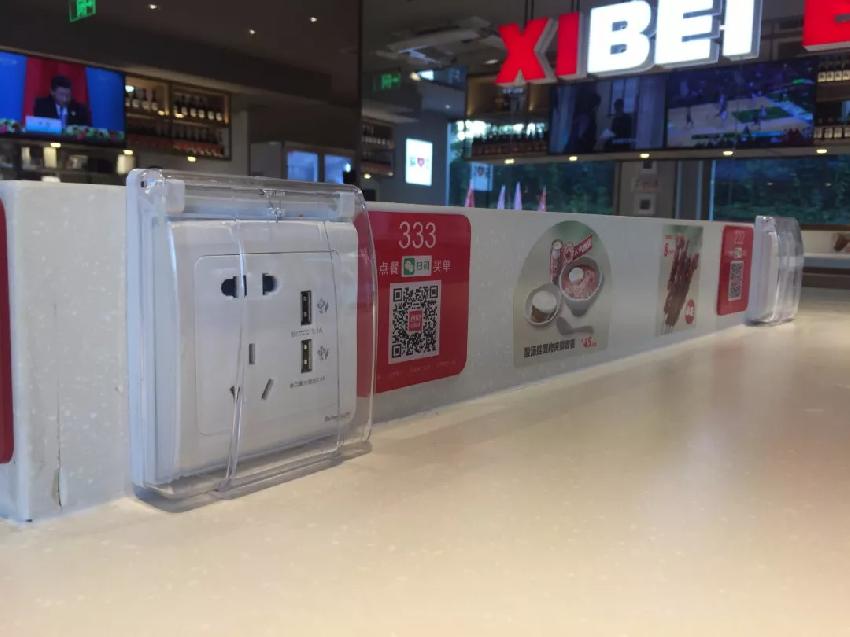 在这个不到 300 平米的空间内,配备了 6 个屏幕,6 月底开业后,直播世界杯比赛成了它们最主要的工作,如果对头上的电视内容不感兴趣,埋头专心玩手机也是可以的,为了防止顾客手机电量不足,西贝在每个位置上配置了电源和 USB 接口。